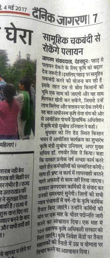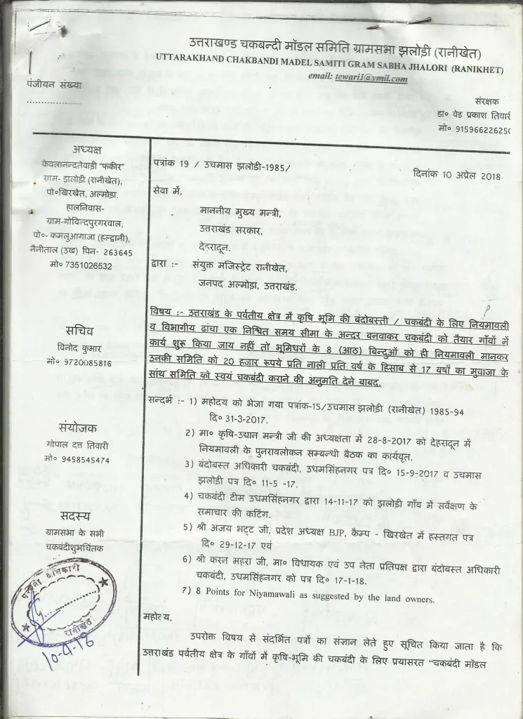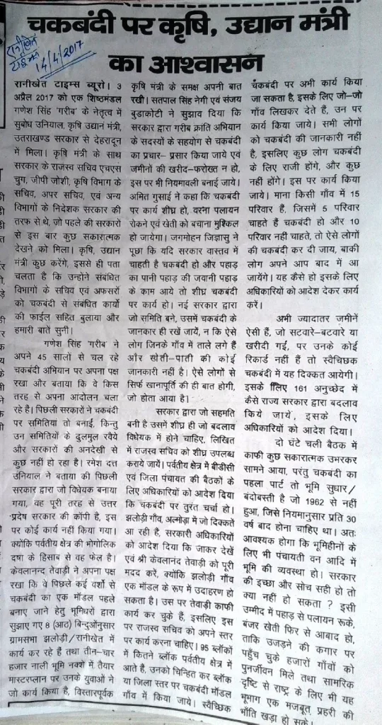 2014 से 2016 तक तीन वर्षों का 63 पन्नों का पत्राचार नयी सरकार को 31 मार्च 2017 के पत्र द्वारा वर्तमान मा० मुख्यमंत्री जी को देने के बाद 3 अप्रेल 2017 को चकबंदी समर्थकों संग पौड़ी जनपद निवासी आ० गरीब जी की अगुवाई में मा० कृषि-उद्यान मंत्री एवं अनेक सचिवों के सांथ देहरादून में बैठक हुई जिसमें उक्त झलोड़ी/रानीखेत चकबंदी मॉडल क्षेत्र के नक्शे-खसरे-मास्टरप्लान आदि जो स्वयं भूमिधरों ने अपने 8 (आठ) बिन्दुओं की नियमावलीनुसार तैयार की है, उनकी विस्तृत जानकारी सभा को दी गयी.