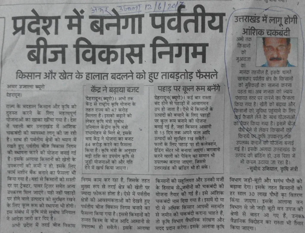 मा० कृषि-उद्यान मन्त्री जी के सांथ 3 अप्रेल 2017 की बैठक के बाद मा० मन्त्री जी की अध्यक्षता में चकबंदी की नयीं समिति का गठन किया गया जिसकी 28 अगस्त 2017 को देहरादून में बैठक हुई जिसमें ग्रामसभा झलोड़ी में स्वैच्छिक चकबंदी पर पुन: पत्र-तथ्यों के सांथ चर्चा हुई तथा “आंशिक चकबंदी हेतु” भी ग्रामसभा कारचूली/रानीखेत के अंतर्गत ग्राम भटोड़िया के लगभग 50 परिवारों की लगभग 322 नाली भूमि जो एक अलग टुकड़े में है, उसके लिए भी भूमिधरों की सहमति उन्हीं के 8 (आठ) बिन्दुओं की नियमावालीनुसार इसके 4 (चार) मुख्य दादा/परदादाओं के नाम की अलग-अलग कुल भूमि निकाल कर चार चकों में बांटने हेतु ग्रामपंचायत का प्रस्ताव के सांथ जो पत्र दि० 20 जून 2017 के द्वारा सचिव राजस्व को भेजा गया था, इन सभी पत्र-तथ्यों को भी सभा में प्रस्तुत किया गया. इन्हें सराहते हुए गढ़वाल मंडल के कुछ गांवों को भी चयन करके तुरंत चकबंदी कार्य आरम्भ करने हेतु चकबंदी की नियमावली तथा अधिनियम के पुनरावलोकन आदि पर चर्चा के उपरान्त एक कार्यवृत्त तैयार किया गया, किन्तु ये सब आज डेढ़ वर्ष बाद भी बिचारणीय ही हैं ? (संग्लग्न आंशिक चकबंदी के पत्र एवं बैठक का कार्यवृत्त 216 to 223 देखें). क्रमश: ….