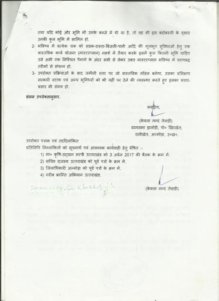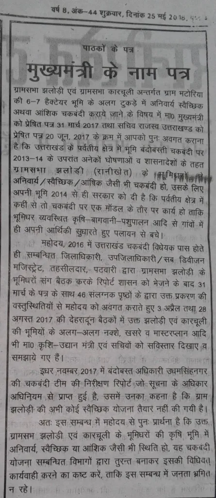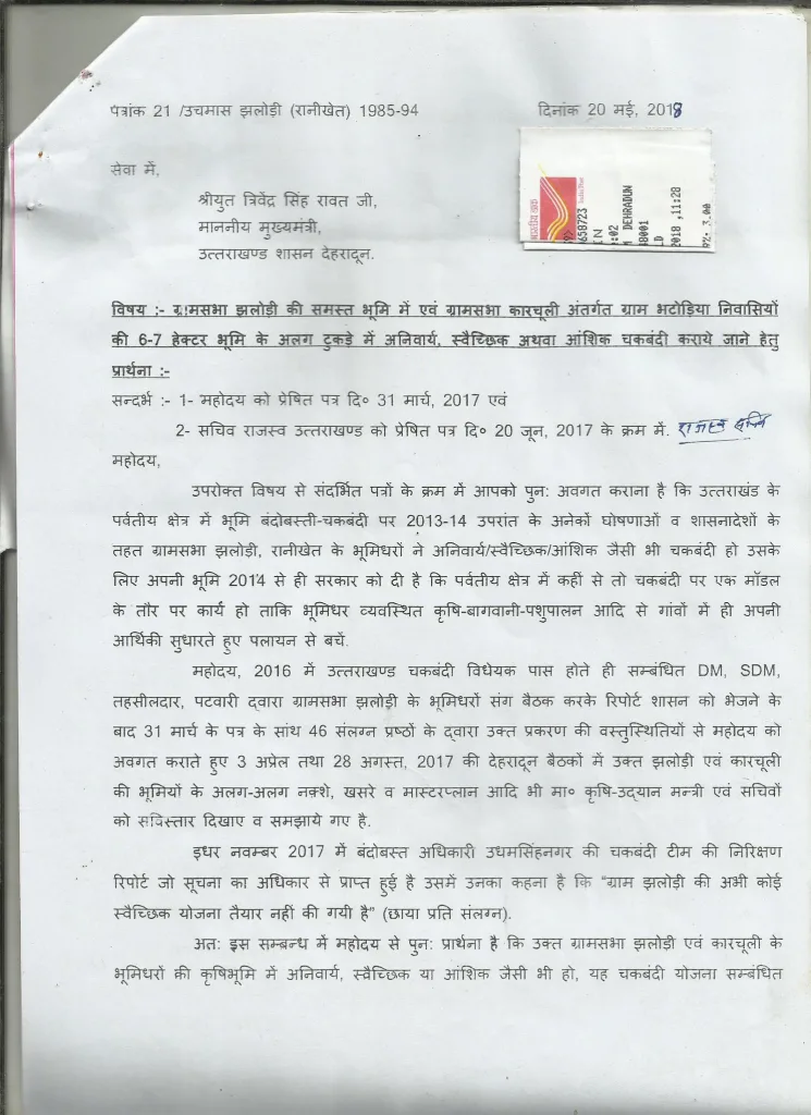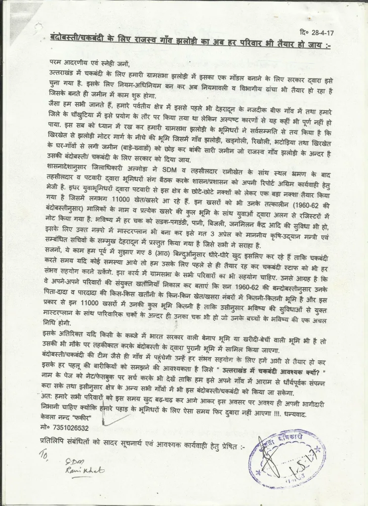 इससे प्रोत्साहित होकर युवाओं ने रानीखेत तहसील से झलोड़ी गाँव के भूमिधरों के रिकार्ड निकालने के सांथ-सांथ ग्रामसभा कारचूली अंदर गाँव भटोड़िया की भूमि में आंशिक चकबंदी हेतु ग्रामप्रधान से प्रस्ताव व अलग-अलग परिवारों की भूमि का विवरण भी निकाला गया. DM महोदय एवं संबंधितों से भी वस्तुस्थितियों की जानकारी लेकर भूमिधरों को तैयार रहने के लिए कहा गया कि कभी भी चकबंदी टीम गाँव आकर स्वैच्छिक एवं आंशिक चकबंदी पर भी अपना काम शुरू कर सकती है !!! इन पत्रों के सांथ-सांथ 29-5-2017 को पौड़ी के जिला पंचायत भवन की बैठक जिसमें मा० कृष-उद्यान मंत्री जी ने अपनी उपस्थिति दी थी वहाँ से भी मा० मुख्यमंत्री जी को भेजे गये पत्रों को भी देखें.