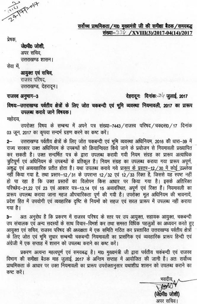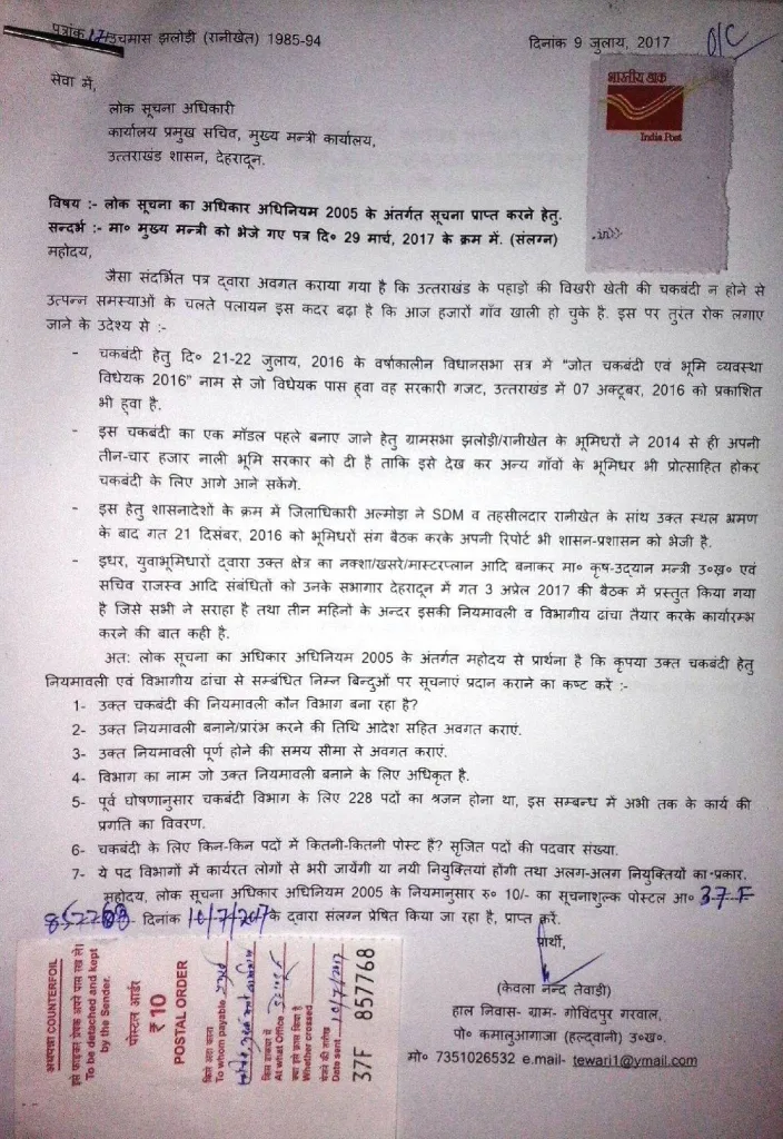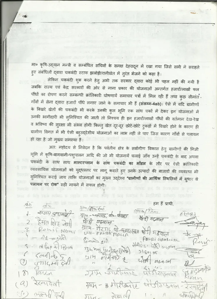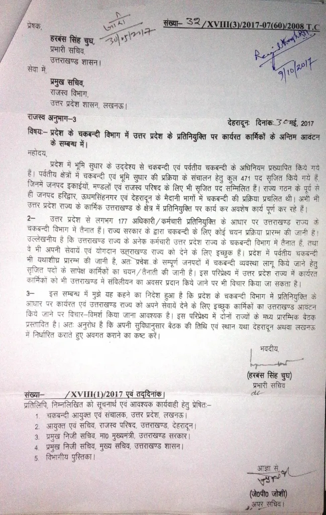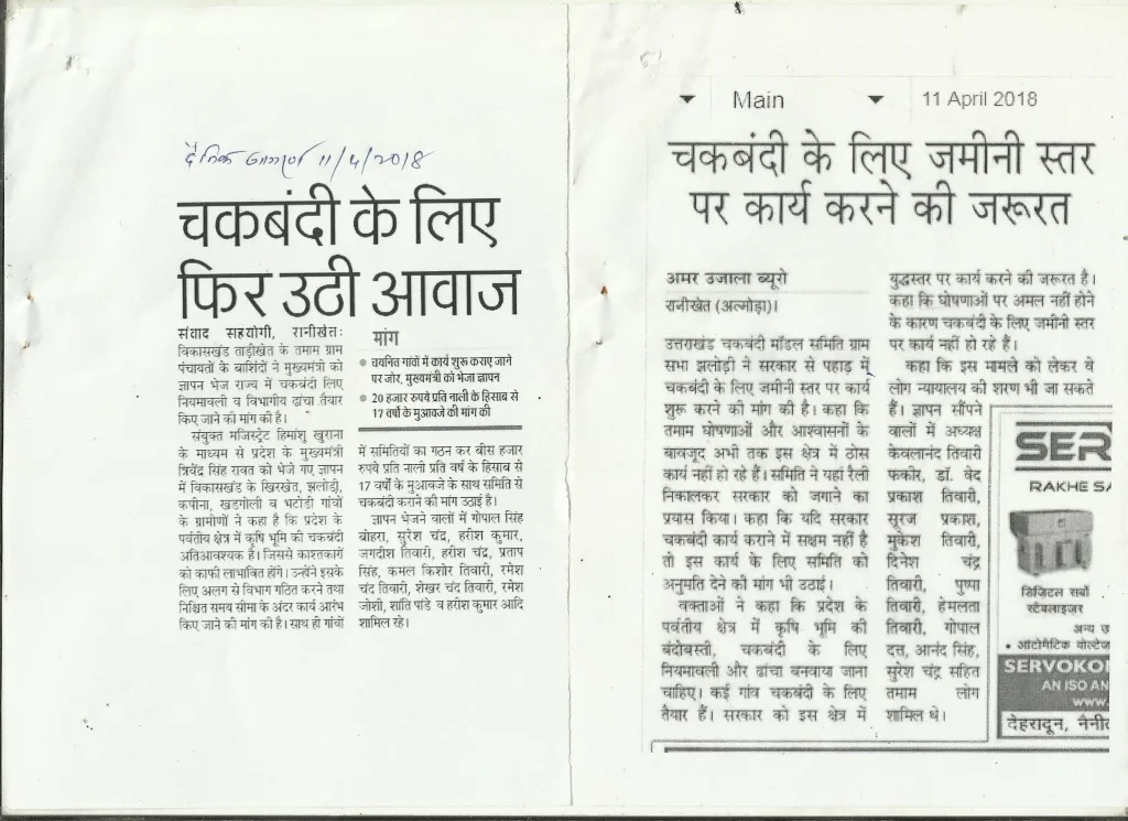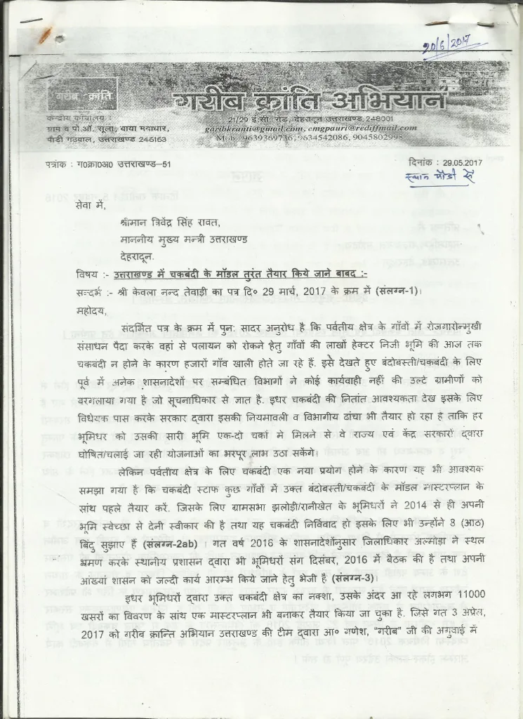इस सम्बन्ध का एक लंबा पत्राचार जो 1985 से उत्तरप्रदेश सरकार के सांथ चला था, अभी अपनी उत्तराखंडी सरकार के सांथ भी लगातार चलता ही आ रहा है जिसे चकबंदी शुभचिंतकों के आग्रह पर यहाँ क्रमवार दिया जा रहा है…