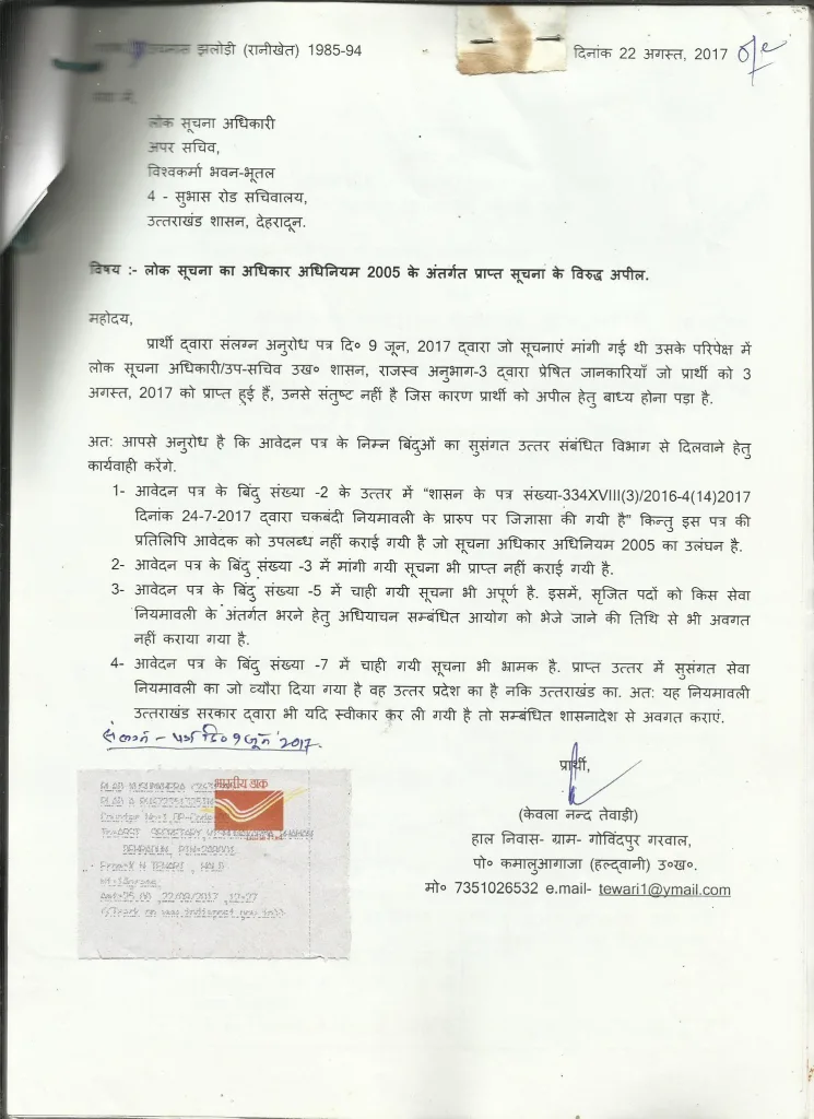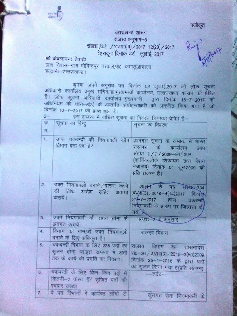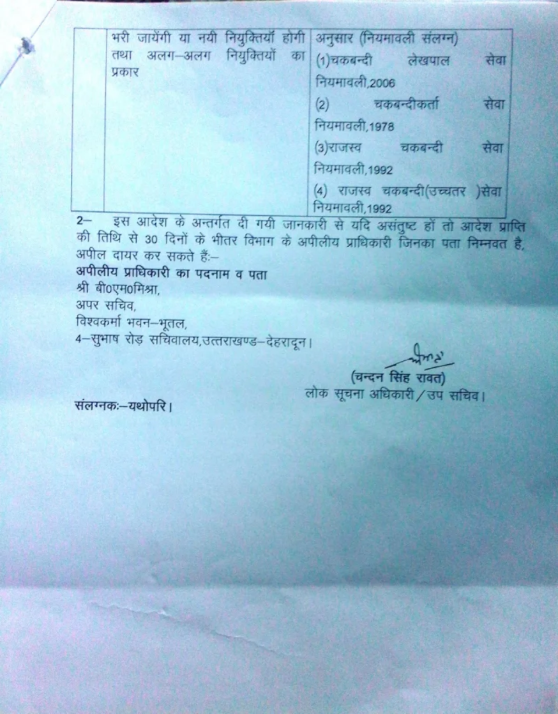 इस पर पुन: 22 अगस्त को अपील करने के बाद 11 सितम्बर की सुनवाई में कुछ पत्र-तथ्य तो मिले किन्तु विभागीय ढाँचे के बारे में प्रभारी सचिव उत्तराखंड शासन ने अपने पत्र 30 मई 17 के द्वारा राजस्व विभाग उप्र० शासन लखनऊ को कहा है कि यहाँ 471 पद सृजित हैं जिनमें से 177 पदों को उप्र० से लिया जाएगा और इधर आनन-फानन में चकबंदी के लिए कभी 228 पोस्टों की तो कभी 707 पोस्टों की भर्ती होने के समाचार भी निकाल दिए गये… !!!