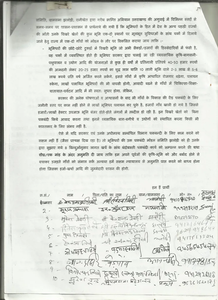 “ हमारे द्वारा यानि भूमिधरों द्वारा ग्रामसभा झलोड़ी में अभी स्वैच्छिक चकबंदी की योजना तैयार नहीं की गयी है ”.