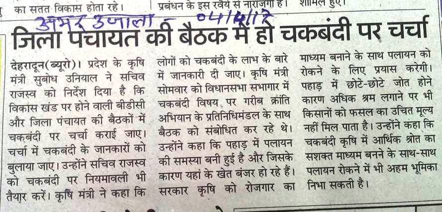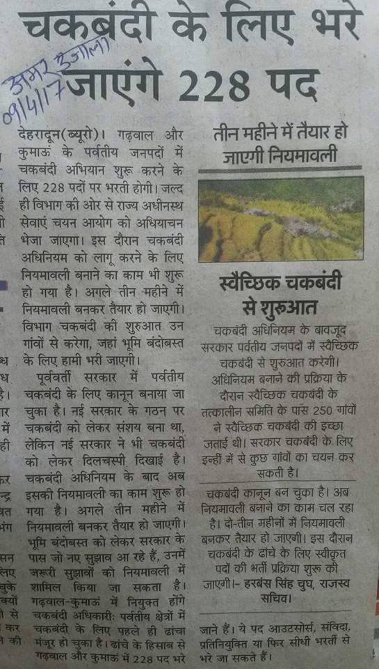 बैठक में तय हुवा कि चकबंदी की नियमावली तीन महीनों में बनाकर स्वैच्छिक चकबंदी को तैयार गांवों में अबिलम्ब कार्य किया जायेगा तथा जिन गाँवों में 10-15 परिवार भी चकबंदी को तैयार होंगे उन गाँवों में आंशिक चकबंदी भी की जायेगी !!! समाचारों की कटिंग देखें.