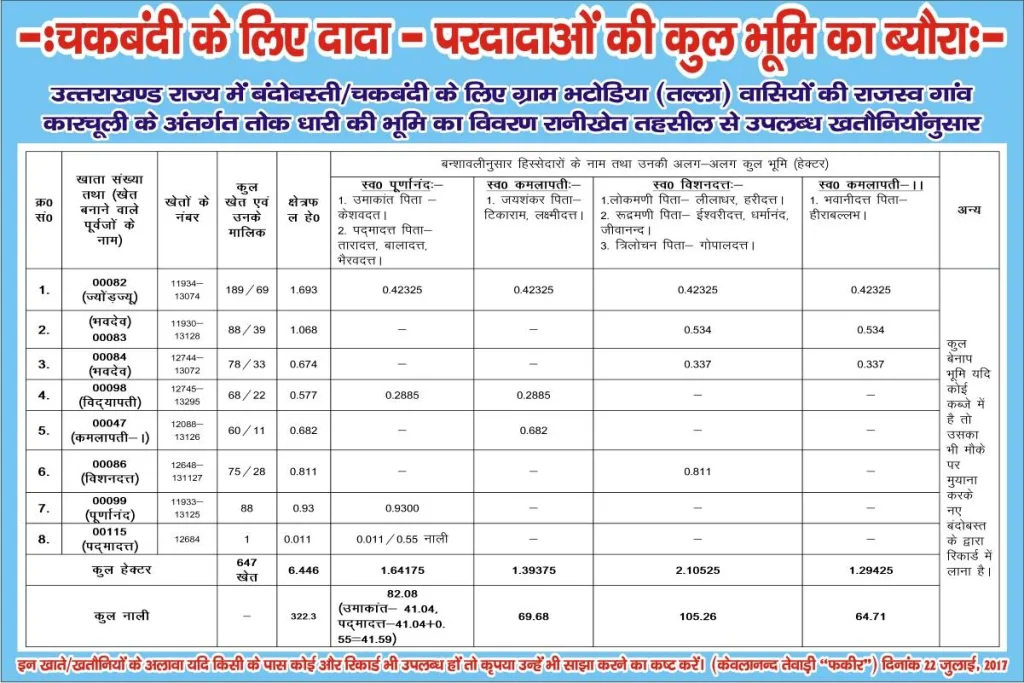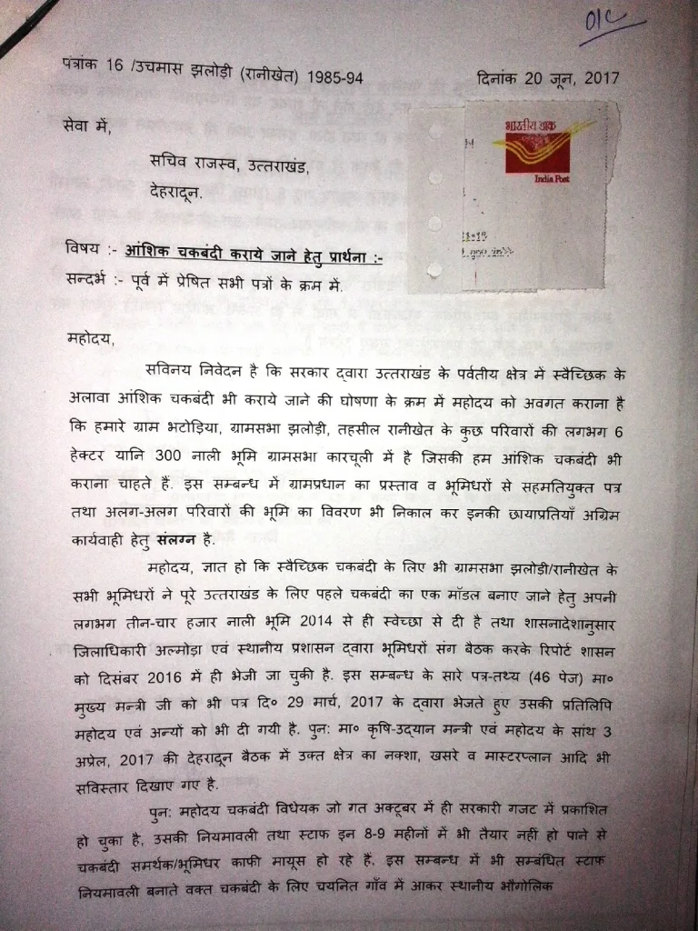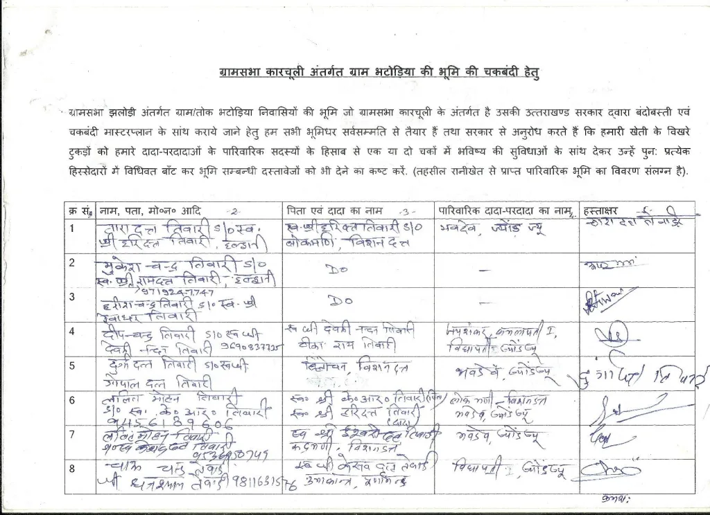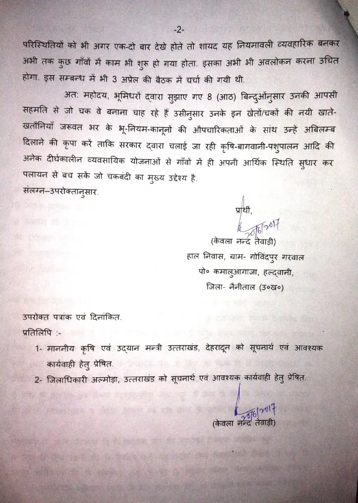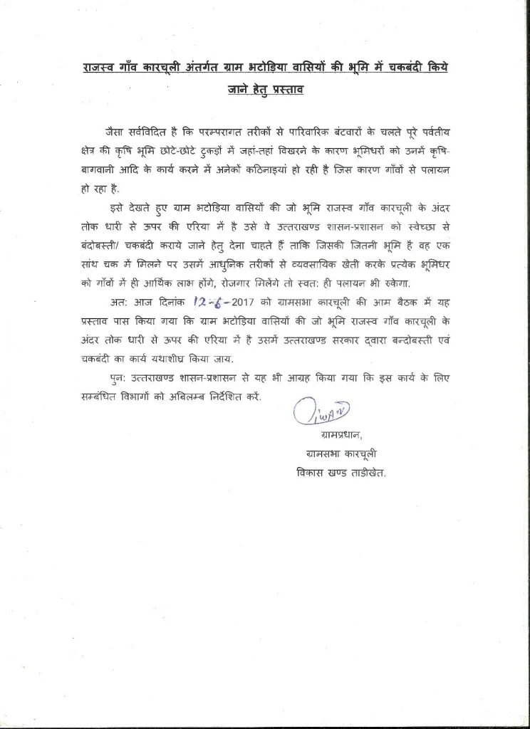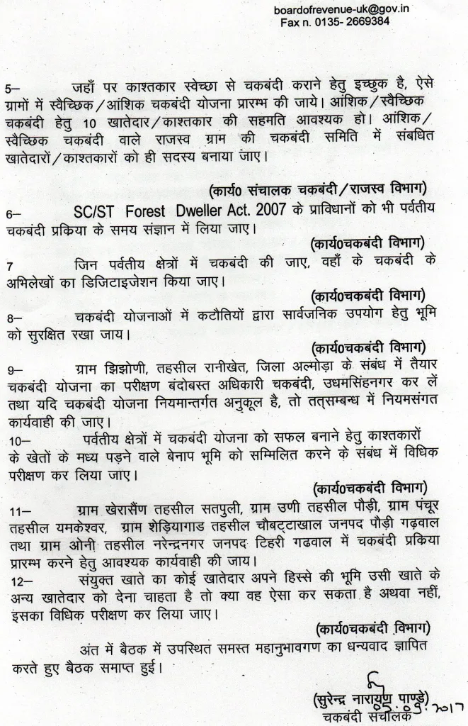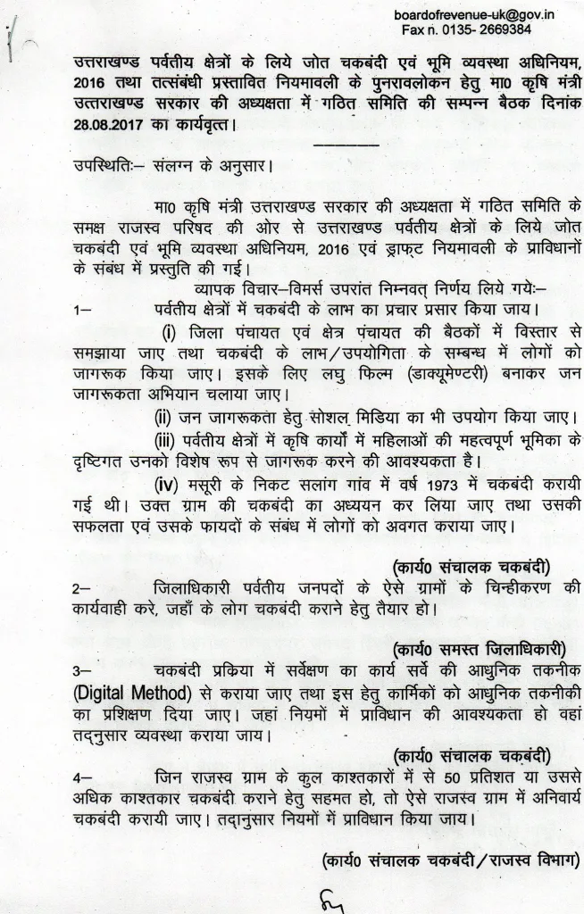 मा० कृषि-उद्यान मन्त्री जी के सांथ 3 अप्रेल 2017 की बैठक के बाद मा० मन्त्री जी की अध्यक्षता में चकबंदी की नयीं समिति का गठन किया गया जिसकी 28 अगस्त 2017 को देहरादून में बैठक हुई जिसमें ग्रामसभा झलोड़ी में स्वैच्छिक चकबंदी पर पुन: पत्र-तथ्यों के सांथ चर्चा हुई तथा “आंशिक चकबंदी हेतु” भी ग्रामसभा कारचूली/रानीखेत के अंतर्गत ग्राम भटोड़िया के लगभग 50 परिवारों की लगभग 322 नाली भूमि जो एक अलग टुकड़े में है, उसके लिए भी भूमिधरों की सहमति उन्हीं के 8 (आठ) बिन्दुओं की नियमावालीनुसार इसके 4 (चार) मुख्य दादा/परदादाओं के नाम की अलग-अलग कुल भूमि निकाल कर चार चकों में बांटने हेतु ग्रामपंचायत का प्रस्ताव के सांथ जो पत्र दि० 20 जून 2017 के द्वारा सचिव राजस्व को भेजा गया था, इन सभी पत्र-तथ्यों को भी सभा में प्रस्तुत किया गया. इन्हें सराहते हुए गढ़वाल मंडल के कुछ गांवों को भी चयन करके तुरंत चकबंदी कार्य आरम्भ करने हेतु चकबंदी की नियमावली तथा अधिनियम के पुनरावलोकन आदि पर चर्चा के उपरान्त एक कार्यवृत्त तैयार किया गया, किन्तु ये सब आज डेढ़ वर्ष बाद भी बिचारणीय ही हैं ? (संग्लग्न आंशिक चकबंदी के पत्र एवं बैठक का कार्यवृत्त 216 to 223 देखें). क्रमश: ….