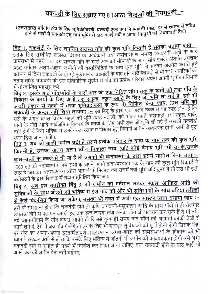 हमारे देश में यह चकबंदी 1920 से लागू है. यही हमारा पडौसी राज्य हिमाचल प्रदेश ने 1971 में पंजाब से पृथक राज्य मिलते ही सबसे पहले अपने भूमिधरों के लिए यह चकबंदी लागू की जिसके चलते हिमाचल प्रदेश की अर्थव्यवस्था उद्यान आधारित है. लेकिन हमारे पहाड़ में यह चकबंदी भी आज तक लागू नहीं हो पाई है?
