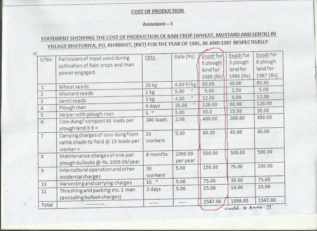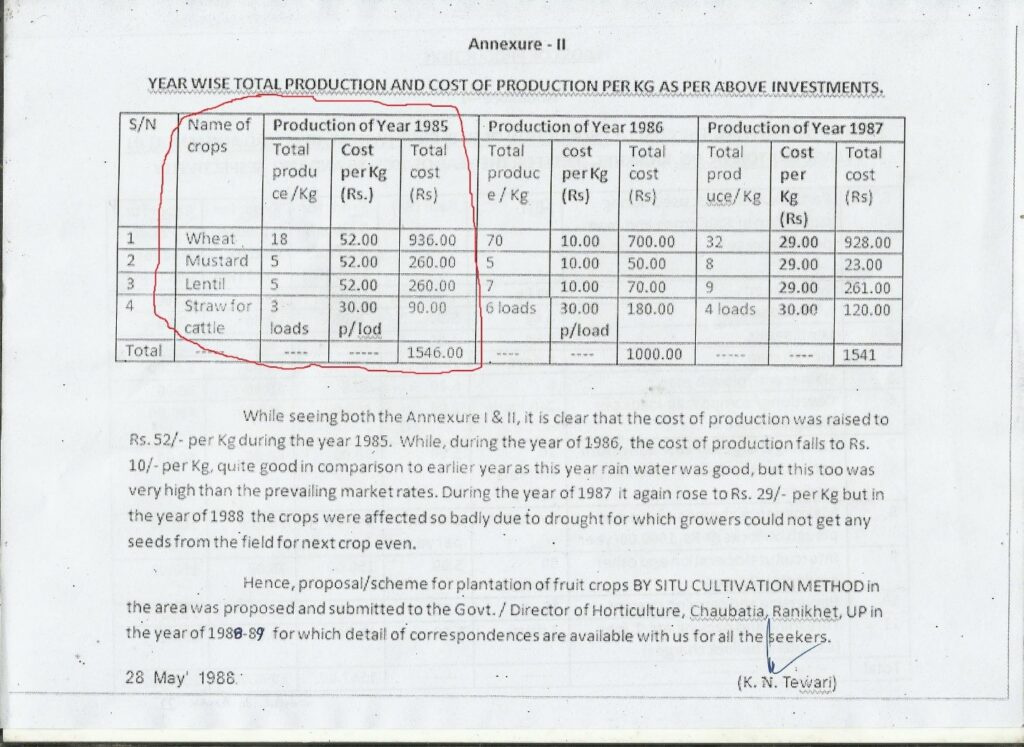 इस सम्बन्ध में कहना है कि 1960-62 के बाद भूमिबन्दोंबस्त रोकना, कुजा एक्ट भी लागू कराना, इस सीमित कृषिभूमि को गोलखातों में दूर दूर खेतों में बिखरे रहने देना, बंदरों-सुवरों-बाघों आदि हिंसक जानवरों को बढाना, चकबंदी एक्ट पास होते हुए भी उसे लागू नहीं कराना, करोड़ों हेक्टर कृषिभूमि को बंजड होने देना आदि आदि से लगता है किसी बहुत बड़ी साजिस के तहत ये सब हो रहा है. जबकि, 1985 में ही हमने तत्कालीन उत्तर प्रदेश शासन को पहाड़ के इन दूर दूर बिखरे सीढ़ीदार खेतों में फसलों की पैदावार लागतें तब 52/- रूपये प्रति किग्रा० तक बैठने के आंकड़े प्रस्तुत किये हैं.